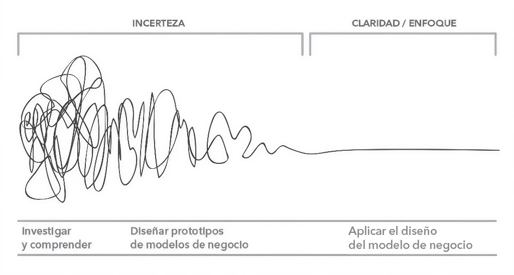 Tal como lo indican las líneas conflictuadas, sin sentido y con desorden, así es como se vive el proceso al emprender e innovar, es doloroso y complejo de entender; en la mayoría de los casos solo el emprendedor tiene clara la visión de lo que es la empresa o su proyecto. Se requiere de una herramienta y un método que reduzca el ruido y el desorden, que nos de claridad y despeje la niebla que no nos permite ver más allá del día a día.